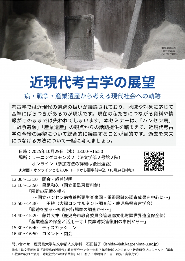 10月29日(金)に鹿児島大学で開催される、鹿児島大学セミナー「近現代考古学の展望:病・戦争・産業遺産から考える現代社会への軌跡」において、当館からも黒尾和久部長が参加をし、「重監房跡の発掘調査」の成果を発表します。