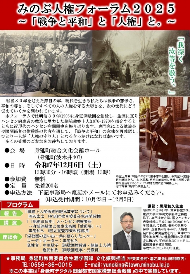 戦後80年を迎えた節目の年。現代を生きる私たちは戦争の悲惨さ、平和の尊さ、そしてすべての人の人権を守る大切さを、次の世代にどう伝えていくかを問われています。本フォーラムでは1906(明治39)年に身延深敬園を創設し、生涯に亘りハンセン病患者の救済に尽力した綱脇龍妙上人(1876生-1970没)を紹介するとともに近現代のハンセン病問題史を振り返ります。専門家による講演会や園関係者の体験談の共有を通して、「戦争と平和」の意味を再確認し、ひとり一人が「人権の守り人」となるきっかけになれば幸いです。多くの皆様のご参加をお待ちしております。