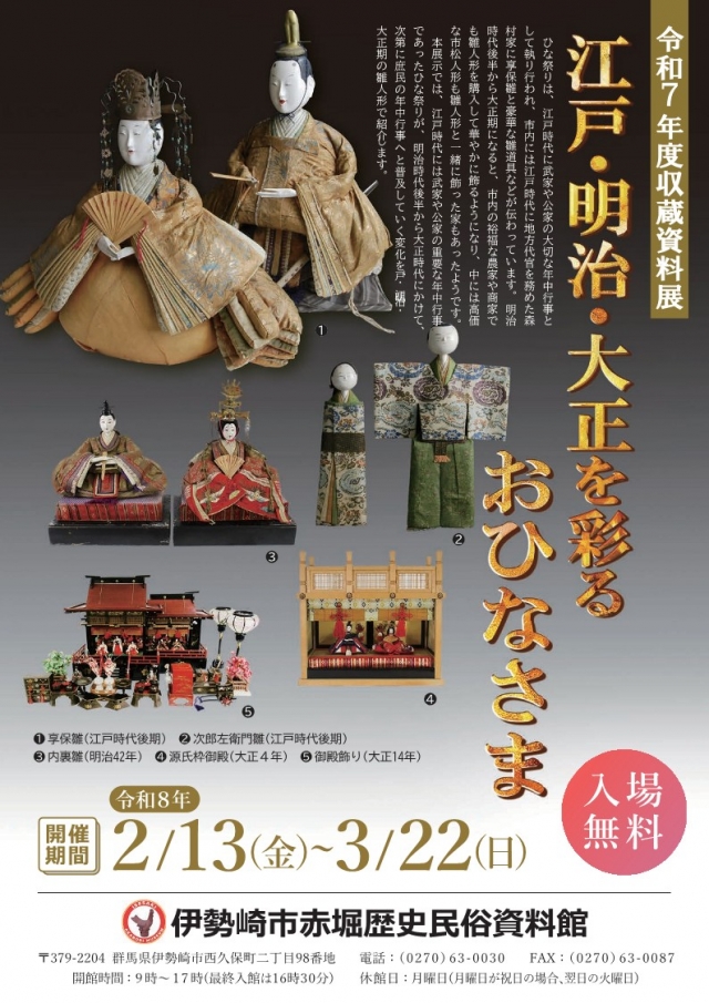 - 令和7年度収蔵資料展「江戸・明治・大正を彩るおひなさま」【伊勢崎市赤堀歴史民俗資料館】2026年01月28日